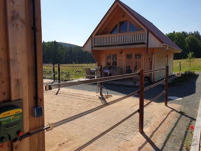Ganz neue Moeglichkeit fuer Studenten mit Pferd Ein Holzferienhaus voll ausgestattet mit angrenzenden Offenstall Preis 450,-/Monatlich pro Pferd ( Putzplatz,Sattelkammer),Reithalle 20/60, Reitplatz 20/40, Longierhalle 18 m Durchmesser, wunderschoenes Ausreitgebiet, Optimale Verhaeltnisse um zu Studieren und sein Pferd dabei zu haben.